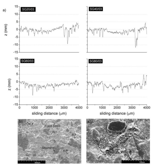 In Figure 5b, the SEM image of the surface of the brake pad labeled C20/03 after being subjected to the pin-on-disk test is shown. For clarification, we highlighted, with a dotted line, the limit of the test (the bottom part of the image corresponds to the eroded area). Therein, some graphite particles can be observed, as planar, dark, and large particles, glass fibers, and ELT rubber particles are present in both parts of the image. In the eroded area, it is possible to observe some voids appearing because of the elimination of particles with the consequent debris formation as well as some remainders of the tribolayer formed during the test. The size of the voids was about 100–200 μm, which is approximately the size of the ELT rubber particles. In the images, the identification of the ELT rubber particles in the brake pad elements was realized by recognizing these particles with a weak or even hollow interfaces, which is the origin of the porosity in the pad elements. In Figure 5c, the high-resolution SEM image of an ELT rubber particle partially covered with a planar graphite particle is presented, and the poor interface between the matrix and the ELT rubber particle can be observed.