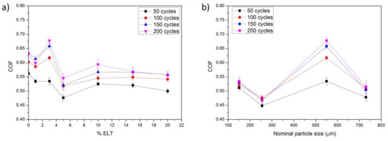 It is known that the properties of the particle-resin composites depend strongly on the particle size, particle–matrix interface adhesion, and particle loading. The particle-matrix interface is also determined by the size of the particles and their surface properties. A closer look into the results shown in Figure 7b allows distinguishing two differentiated behaviors dependent on the grinding procedure. Particles sized below 320 μm were subjected to a cryogenic grinding; thus, they were brittle and their surface was defined by planar sides, as shown in the SEM images in Figure 1. There was almost no dispersion between the different braking cycles in the COF. On contrary, the use of particles subjected to ambient grinding produced a major dispersion of the results, especially when using the particles of the lower size, a fact that is attributed to their inhomogeneous surface [36]. Although the A80 particles also possess a highly homogeneous surface, the decrease of the COF must be attributed to the plastic deformation of the ELT particles, as observed by some other authors [19,20]. Cryogenic grinding produces regular particles with a smooth surface and therefore a lower COF was observed [37]. Binding to the resin matrix is also enhanced in the case of the cryogenic grinding, a conclusion which can be extrapolated from the low data dispersion obtained along the different braking cycles [36].
