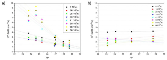 FP is then related to the vehicle speed, the applied pressure (N) to the braking pad, and the quality of the friction pad or its COF value [38]. For a specified distance (number of braking cycles), SWR and FP (Equation (3)) can be calculated. The values of SWR and FP at the different braking distances in the tests carried out at medium speed (2.30 m/s) and medium friction load (20 N) which correspond to contact pressures (p) of 0.022 MPa are plotted in Figure 8. In all the cases, the braking area was of 9 cm2 in area and the p.ν values were 0.43 MPa m/s for all prepared composite pad elements that, despite being relatively low (they must be in the range 0.3 to 20 MPa m/s), some authors have considered adequate to investigate these materials [39]. The obtained SWR values were between 10−4 mm3/N for the pads containing the A80 particles and at high sliding distances to about 9 × 10−4 mm3/N for the brake pads containing the A60 particles at the maximum concentration. These values fall in the range of some brake pads containing natural recycled particles [40], where a SWR value of 7.22 10−4 mm2/N under a load application of 7.5 N has been reported, but they are higher than the composite pads filled with abrasive ceramics possessing COF of about 0.7 and SWR values below 4 10−4 mm2/N at 20 N load [41].