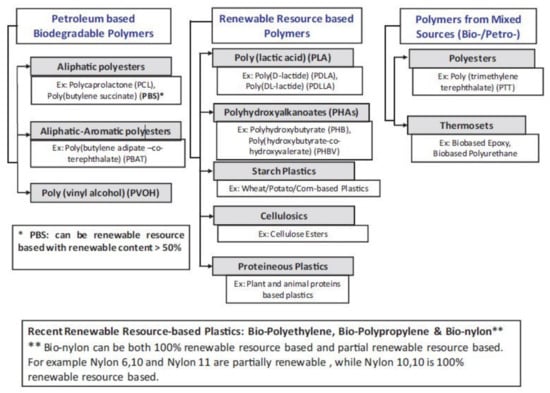 Generally, bioplastics could be classified into petroleum-based biodegradable polymers, renewable resource-based polymers and polymers from mixed sources (bio- and petroleum-based) as shown in Figure 1. According to the classification, the biodegradability of the polymers depends on the structure but not on the raw material source [12]. Therefore, biodegradable polymers may include both petroleum-based and bio-based polymers. We focus only on several cheap, abundant biodegradable biopolymers herein—polylactide (PLA), polycaprolactone (PCL), polybutylene succinate (PBS), polybutylene adipate-terephtalate (PBAT), polyhydroxyalkanoate (PHA) and thermoplastic starch (TPS).