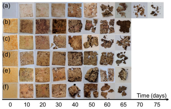 Photos of (a) PBS; (b) 40% NFC; (c) 7/3; (d) 5/5; (e) 3/7 and (f) 40% MCC films during biodegradation studies in soil burial test conducted in composting conditions [55].