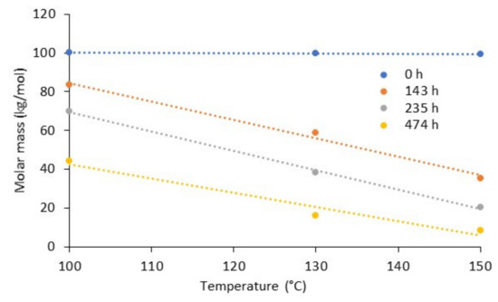 Molar weight of PLA during thermo-oxidative ageing as a function of exposure temperature. Dots: experimental data used from [116]; lines: linear approximations.