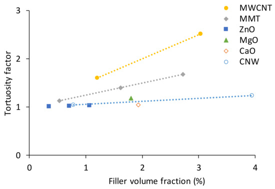 For instance, PLA filled with ZnO [11,129], CaO or MgO [47], MMT [17,130], MWCNT [15] and CNW [13] are characterized by different tortuosity factors according to Equation (6). The tortuosity factor–filler volume fraction relationship is shown in Figure 6. The densities, relative weight fractions and aspect ratios for the nanofillers were taken from the data provided in the according papers.