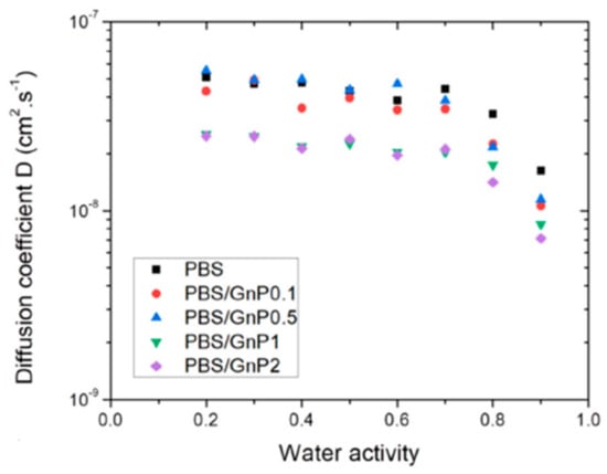 Diffusion coefficient as a function of water activity for neat PBS and PBS/GnP nanocomposites [99].