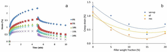 where r is the reinforcement efficiency factor; and are the elastic moduli of the composite and matrix, respectively. Platnieks et al. have studied the elastic properties of PBS/NFC composites processed by melt blending and solution casting [142]. By comparing r factors, the authors demonstrated the superior effectiveness of the former processing method. Hydrothermal ageing effects on the stiffness reduction of epoxy/graphene oxide nanocomposites appeared in the decrease of the reinforcement efficiency and r drop from 1.6 to 0.14 were highlighted in [141].