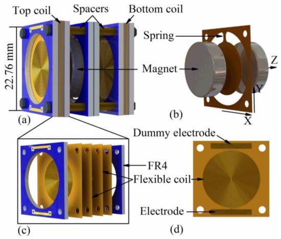 Electromagnetic vibrational energy harvesters (EVEHs) are devices that convert ambient vibrations to electrical power, often by the relative movement between a permanent magnet and a solenoid coil [1,2,3,4]. Compared with its piezoelectric and electrostatic counterparts, the EVEHs possess advantages such as simpler design and structure, higher output power, and easier fabrication [5]. The EVEHs can be implemented by using macroscopic components, printed circuit board (PCB) technology [6,7,8,9], and microelectromechanical systems (MEMS) technologies [10,11,12].