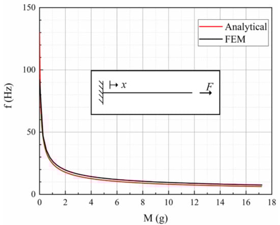 where keff is the effective stiffness of the spring calculated by the finite-element method (FEM), m is the total mass of the beam, and M is the mass of the disc magnet, the applied axial tensile load F is equal to the gravity of disc magnet. Equation (13) is a rough estimation as it assumes a spring with uniform cross-section. In order to verify the fundamental frequency calculated by (13), FEM simulation based on the computed value of the spring is conducted by using COMSOL Multiphysics. The fundamental natural frequency of the EVEH analytically calculated by (13) and simulated by FEM shows good agreement with each other, as shown in Figure 2. The resonant frequency of the spring decreases when the mass of the magnet increases, the decreasing rate is higher when the mass is smaller.