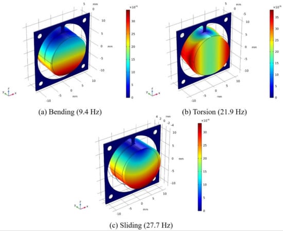 Due to potential collision between the magnet and the coil, it is difficult to model the behavior of the EVEH device. In order to study the dynamic characteristics of the spring, modal analysis on the resonant mode and frequency of the proposed EVEH is conducted via FEM by using COMSOL Multiphysics, as shown in Figure 3. The model included the gravity of the magnet. Moreover, the primary resonant mode is the bending mode of the spring, similar to the bending of a cantilever. The simulated resonant frequency of the bending mode is 9.4 Hz. Nevertheless, the FEM simulated frequency of the bending mode is not accurate, as the bending mode is strongly influenced by the axial stress in the spring. It is difficult to include the stress in the FEM model since the stress distribution within the spring is rather complex. The main sources of the stress in the spring include mean residual stress and stress gradient from the manufacturing process. The second and the third resonant modes are torsional mode and in-plane sliding mode at 21.9 Hz and 27.7 Hz, respectively. The factors ignored in the FEM mode is the imperfect clamping condition at the spring as well as inaccuracy in the geometry of the device from the assembly process.