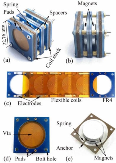 Photos of the (a) fabricated EVEH device, (b) side view of the EVEH device, (c) flexible polymer coils and FR4 boards, (d) assembled flexible coil stack, and (e) magnets and spring.