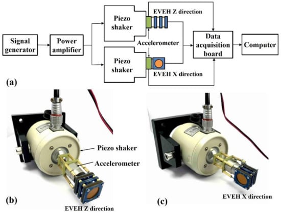 (a) Schematic illustration of the setup for characterizing the EVEH device; (b) photo of the Z direction measurement setup; and (c) photo of the X direction measurement setup.