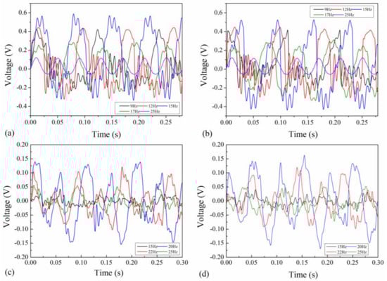 The time-dependent open-circuit output voltage of the EVEH on (a) Z-direction in top coil; (b) Z-direction in bottom coil; (c) X-direction in top coil; and (d) X-direction in bottom coil.