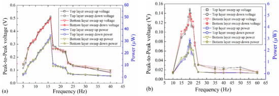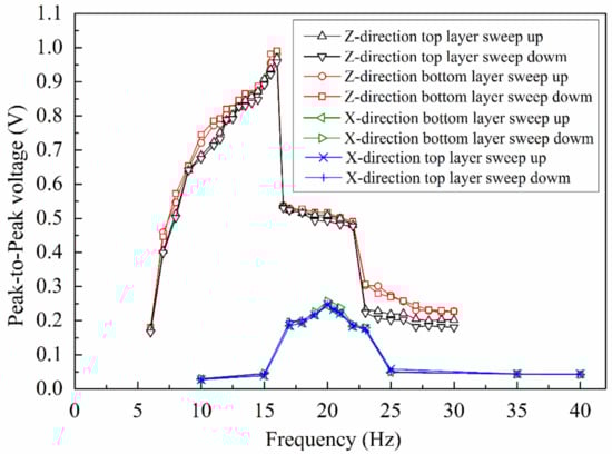 The peak-to-peak open-circuit output voltage of the EVEH as a function of frequency is shown in Figure 7. The output voltages of the EVEH on Z and X directions are measured by both sweeping up and sweeping down the frequency. The output voltage in both top and bottom coils are measured.