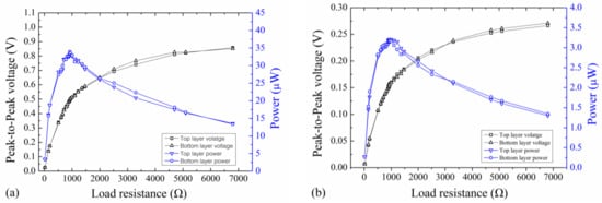 The output peak-to-peak closed-circuit voltage and power of the EVEH device on both Z and X directions is plotted versus the load resistance, as shown in Figure 8. The data in the figure are obtained with an applied excitation vibration of ±1 g and frequencies of 16 Hz (Z direction) and 20 Hz (X direction). On Z direction, the maximum output power of the EVEH is 33.7 μW with an optimal load resistance of 940 Ω. On X direction, the maximum output power of the EVEH is 3.2 μW with an optimal load resistance of 940 Ω. The power on X direction is 10.5 times smaller than on Z direction, because the power is proportional to the square of the voltage. The optimal load value is similar as the measured coil resistance of 937 Ω. The slight difference between the optimal load and the coils resistance originates from the measurement inaccuracy as well as the ignored resistance of the wires.
