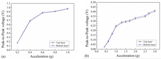 The open-circuit output voltage of the EVEH as a function of acceleration level on (a) Z-direction and (b) X-direction.