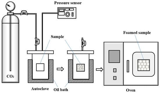 Figure 1 is the diagram of a foaming device. The pre-vulcanized silicone rubber sheet sample with 0.5 mm thickness was put into an autoclave of 250 mL, and the air in this autoclave was replaced by slowly purging with low-pressure CO2 for three times. Then, the autoclave was placed in an oil bath at 35 °C, and CO2 at different pressure was introduced into silicone rubber for 30–180 min before slow depressurization. After pressure relieving, the sample was quickly transferred into an oil bath at 150–180 °C to conduct a rising temperature foaming stage. Finally, the foamed sample was kept in the oven at 200 °C for 120 min for a complete post-vulcanization.