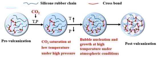 There are four stages of pre-vulcanization, CO2 saturation, bubble nucleation and growth, and post-vulcanization in the temperature rise foaming process, as shown in Figure 2. The pre-vulcanization degree can be controlled by the reaction temperature and time. The temperature during CO2 saturation is controlled at low temperature so that the vulcanization reaction does not further happen. The CO2 content in the pre-vulcanized silicone rubber sample can be adjusted by CO2 saturation pressure and time. The CO2 diffusion and further vulcanization reaction occur simultaneously in CO2 plasticized polymer during bubble nucleation and growth, since the bubble nucleation happens because of the thermodynamic instability induced by the rising temperature, and the bubbles continue to grow up at a certain higher temperature for a period of time. Final post-vulcanization at high temperature aims to achieve complete crosslink networks in foamed samples for stable cell morphology. Therefore, the vulcanization degree of silicone rubber continues to increase except at the high-pressure CO2 saturation stage.