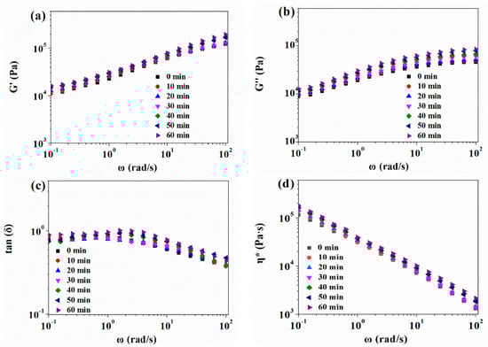 Rheological behavior of silicone rubber samples at different pre-vulcanization times at 35 °C: (a) Storage modulus G′; (b) Loss modulus G″; (c) Loss angle tan (δ); (d) Complex viscosity η*.