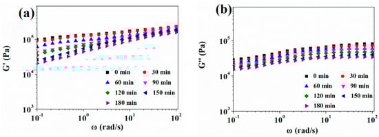 The oscillatory shear test was performed to study the rheological properties of pre-vulcanized silicone rubber after being saturated with 10 MPa CO2 for 30–180 min at 35 °C. As shown in Figure 5, the storage modulus, loss modulus, and complex viscosity all decreased with CO2 treatment time. The shear flow deformation of the silicone rubber was further determined according to Equation (4) [], and the data-fitting results are summarized in Table 2.