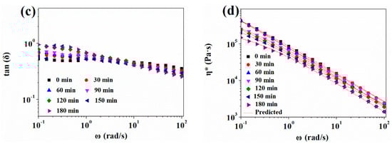 Figure 4 shows the complex viscosity (η*) as a function of frequency (ω) ranging from 0.1 to 100 rad/s for silicone rubber samples with different pre-vulcanization degrees; the complex viscosities change linearly with frequency, but it also could be seen that the change range of the rheological properties of these pre-vulcanized samples was not significant.