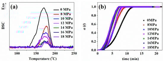 (a) Non-isothermal DSC curves; (b) Relationship between the relative conversion and the vulcanization time for pre-vulcanized silicone rubber samples after being saturated under different pressures.