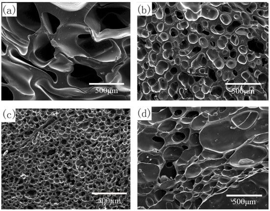 Cell morphology of foamed samples at different foaming temperatures: (a) 150 °C; (b) 160 °C; (c) 170 °C; (d) 180 °C.