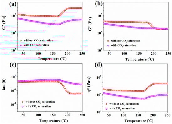 The temperature-dependent rheological properties of pre-vulcanized silicone rubber samples are shown in Figure 10. The occurrence of a further vulcanization reaction resulted in a sudden rising of storage modulus and complex viscosity at higher temperature, but the loss modulus only had a little increase. After CO2 treatment, the storage modulus, loss modulus, and complex viscosity of the vulcanized sample decreased, but their scope of change with temperature was much smaller than that of a sample without CO2 treatment. Figure 4 also exhibited that when the temperature was around 170 °C, the storage modulus of the pre-vulcanized silicone rubber sample after CO2 treatment was slightly larger than its loss modulus, and the loss factor was still close to 1, which would be good for polymer foaming []; this is also corresponding to the foaming results.