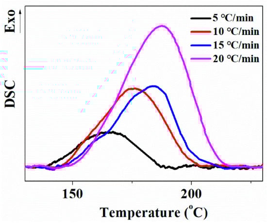 The pre-vulcanization samples were saturated in different CO2 pressure for 120 min at 35 °C, and then, the non-isothermal DSC test was performed immediately with a 5 °C/min temperature rising rate after the CO2 pressure was released slowly, which corresponded to the cell nucleation and growth stage, in which CO2 diffusion and vulcanization reactions were carried out simultaneously. The relative conversion α(t) of the further vulcanization reaction was obtained according to Equation (5).