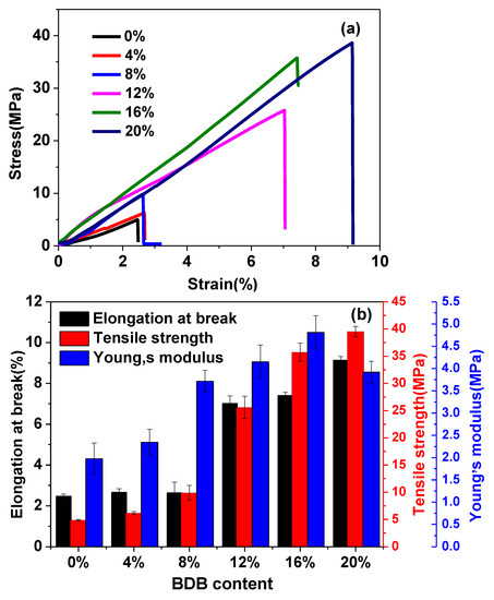 | Sample | Tg (°C) | E’(Tg + 40 °C) (Mpa) | Elongation at Break (%) | Tensile Strength (Mpa) | Young’s Modulus (Mpa) |