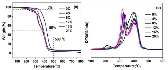| Sample | T5d (°C) | T50d (°C) | Residual Weight at 500 °C (%) | Residual Weight at 800 °C (%) |