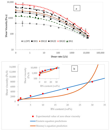 The viscosity increase with increasing BN content was noted especially at lower shear rates. A significant increase (about an order of magnitude) was observed at 5 vol% BN, but the increase continues for higher BN contents. This concentration (5 vol% or less) might be an indicator of a nominal network of particles that competes with molecular mobility of the polymer melt [36]. Zero shear viscosity of the BN/LLDPE composites is plotted in Figure 2b as a function of BN content together with predictions from Einstein and Mooney equations for suspensions [37,38]. Predictions of Einstein’s equation match well with experimental values at lower-moderate BN contents, but prediction using Mooney’s equation capture the significant rise in viscosity for higher BN contents indicating potential problems during extrusion, as will be discussed later.
