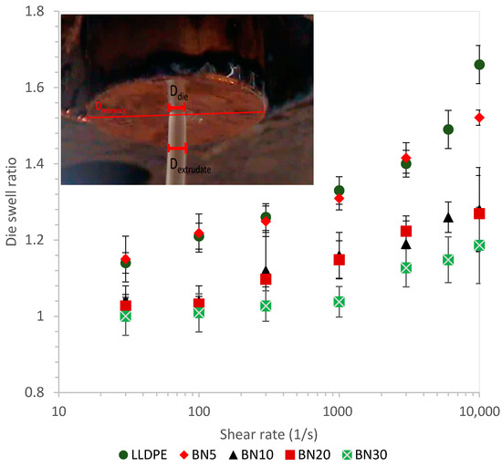 When a viscoelastic fluid flows out of a die without any drawing force, the cross-section dimensions of the extrudate are larger than that of the die [39,40]. This is due to the relaxation of primary normal stresses after the melt exits the die wall and there is essentially a free-surface [41,42]. Investigation of such flow behavior is important for film extrusion because for non-circular die shapes, size and shape of the extrudates after extrusion can vary based on extent of die swell [43]. Therefore, die swell ratios for neat LLDPE and BN/LLDPE blends were measured by using the extrudate diameters exiting the capillary rheometer. As displayed in Figure 3, larger die swell ratios were observed at higher shear rates because more elastic energy is stored. For neat LLDPE, the ratio increased from 1.14 ± 0.03 to 1.66 ± 0.05 by increasing the rate from 30 s−1 to 10,000 s−1, respectively.