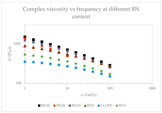 Complex viscosity of BN/LLDPE melts at 210 °C for different BN contents.