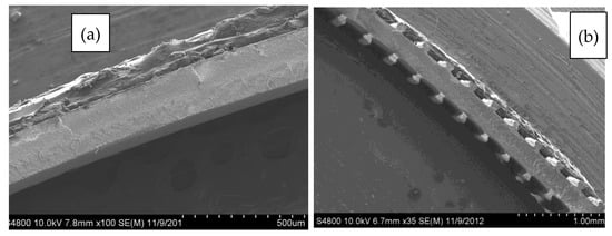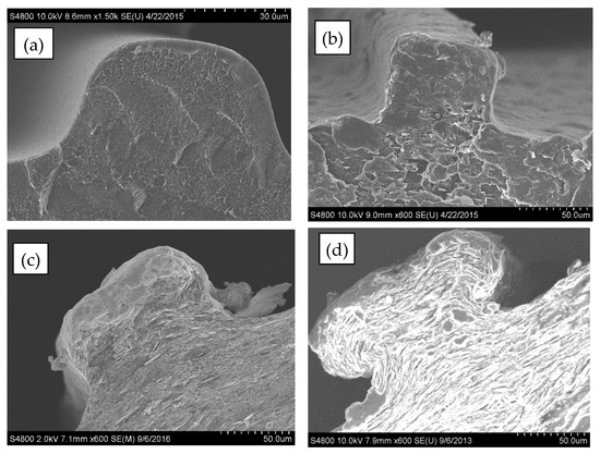 SEM micrographs of the cross-sectional area of the neat and 30 vol% BN films are displayed in Figure 6. The film micro-texture heights were measured at 70 ± 18 µm. Further, micrographs of single textures are displayed in Figure 7a–d, which show that the shape of film micro-texture is slightly different for films containing different BN contents. The shape resembled more closely the die shape as more BN was incorporated into LLDPE. This shape similarity is a result of decreased effect of polymer molecular elasticity and consistent with earlier die swell results where BN decreased molecular elasticity (reduced die swell) due to increased textural elasticity of the composite. As is also evident from Figure 7, texturing led to an extended lateral surface. This resulted in about 11% increase in area for neat LLDPE, 25% increase for 10 vol% BN, 30% for 20 vol% BN, and 45% increase in area for textured films containing 30 vol% BN.