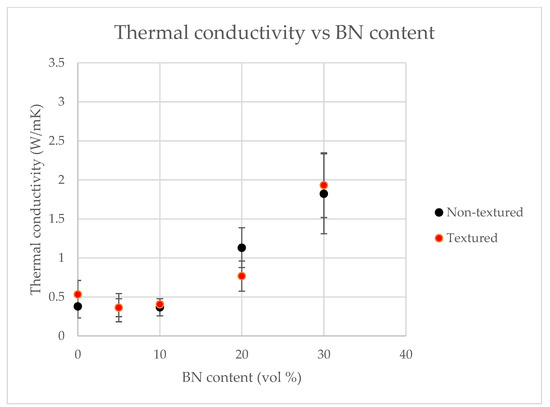 Through-thickness thermal conductivity of the pure polymer was measured to be 0.3 W/m·K and it increased more than five times for the composites containing 30 vol% BN, as shown in Figure 9.