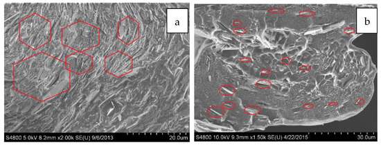 Representative SEM micrographs that showing the cross-sectional area of (a) non-textured, and (b) micro-textured BN/LLDPE films containing 30 vol% BN.