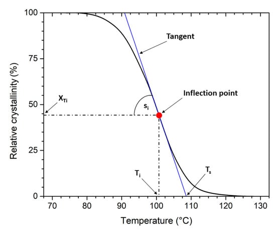 The kinetics of non-isothermal crystallisation was also evaluated according to the method introduced by Kratochvíl and Kelnar []. The principle of the method is schematically shown in Figure 1. It is a new simple method for evaluation of non-isothermal crystallisation kinetics at a constant cooling rate. The procedure based on mathematical treatment of the DSC cumulative crystallisation curves (i.e., the dependence of relative crystallinity on temperature) at their inflection point provides four basic parameters: temperature of the start of crystallisation (Ts), the temperature of maximum crystallisation rate (Ti), the numerical value of the maximum crystallisation rate (si) and final crystallinity after cooling from the melt (Xc). This approach is particularly convenient for the comparison of the non-isothermal crystallisation kinetics of samples in series with one reference, a virgin polymer. The method provides the temperature of crystallisation start (Ts) and maximum crystallisation rate (Ti) with standard deviation 0.3 and 0.4 °C, respectively. Maximum crystallisation rate (si) and final crystallinity (Xc) have coefficients of variation 5.8 and 1.5%, respectively []. The repeatability of Ts, Ti, and si improves with decreasing cooling rate. The method does not refer to any crystallisation models that are used in the evaluation of non-isothermal crystallisation (e.g., Ozawa, Nakamura, or Jeziorny extended Avrami kinetic model and others) [,] and eliminates the problem of exact setting of the starting time of crystallisation. As stated by Kratochvíl and Kelnar in their study [], the parameters obtained sensitively describe the crystallisation process at the maximum rate, i.e., at relative crystallinities of about 35–45%. Thus, this method models real conditions encountered during processing polymeric materials well. The only prerequisite of successful application of the proposed method is a smooth cumulative crystallisation curve, i.e., well-developed crystallisation exotherm obtained by the DSC analysis.