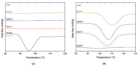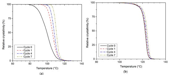 The crystallinity degree (Xc) of the samples as a function of the recycling cycle was determined according to Equation (1), where is the theoretical melting enthalpy of the polymer assumed be 100% crystalline, = 106 J/g for PLLA [], and = 146 J/g for PHBV [].
