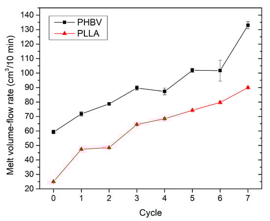 PLLA and PHBV melt volume flow rate as a function of recycling cycle.