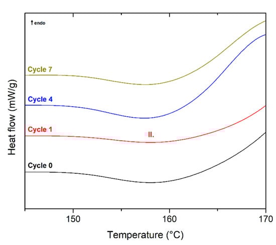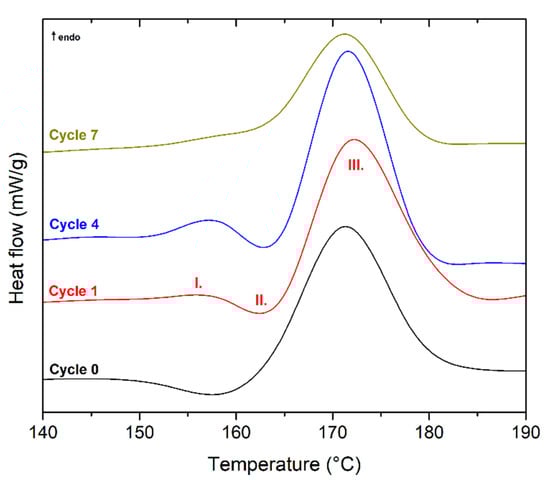 Furthermore, the results showed that repeated mechanical recycling induced a gradual increase in melt crystallisation temperature (Tp,c) (see Figure 2b). As the temperature Tp,c increased, Peak I and Peak II moved to higher temperatures, Peak I became more pronounced, and Peak II was less intense (see Figure 4). In the seventh recycling cycle, Peak I coincided with Peak III. When crystallisation is performed at higher temperatures, due to repeated mechanical recycling, a single melting peak is always present, and its position is strongly affected by Tp,c.