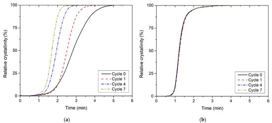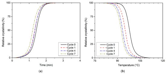 The kinetics of non-isothermal crystallisation of PLLA and PHBV affected by their gradual recycling (in the range of seven recycling cycles) was monitored by DSC at a constant cooling rate of 10 °C/min. The trends in the behaviour of relative crystallinity (XT) over time was recorded (Figure 6). These graphical dependences were constructed from DSC measurements based on Equations (2) and (3). Table 4 shows the values of the half-time crystallisation (t0.5), defined as the time when crystallisation reached 50%. From the results, is obvious that the values of t0.5 for PLLA decrease gradually due to recycling; however, for PHBV, they remain unchanged. A decrease in t0.5 by 11% was recorded in the first PLLA recycling cycle and by 40% in the seventh recycling cycle. The decrease in t0.5 values caused by the gradual recycling of PLLA shows a trend that is typical in the case of faster cooling from the melt, as reported, for example, by Tarani et al. []. This effect is induced by the increase in the melt crystallisation temperature (Tp,c) [], which increases with gradual recycling for PLLA, while for PHBV, the change is insignificant (see Table 1 and Table 2). The reduction in t0.5 caused by repeated mechanical recycling confirms the cleavage of the chains, which act as nucleation centres during the non-isothermal crystallisation of PLLA.