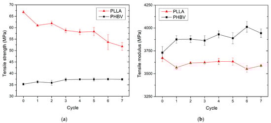 PLLA and PHBV tensile properties as a function of recycled cycle: (a) tensile strength; (b) tensile modulus.