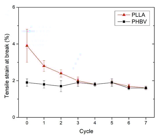 PLLA and PHBV tensile strain at break as a function of recycled cycle.
