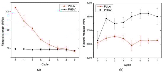 PLLA and PHBV flexural properties as a function of recycled cycle: (a) flexural strength; (b) flexural modulus.
