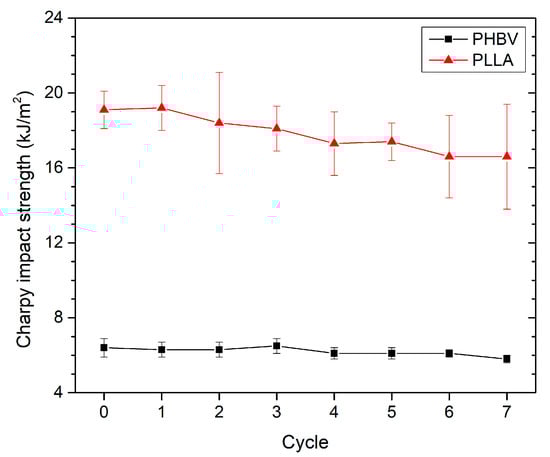 PLLA and PHBV Charpy impact strength as a function of recycled cycle.