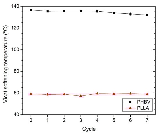 PLLA and PHBV Vicat softening temperature as a function of recycled cycle.