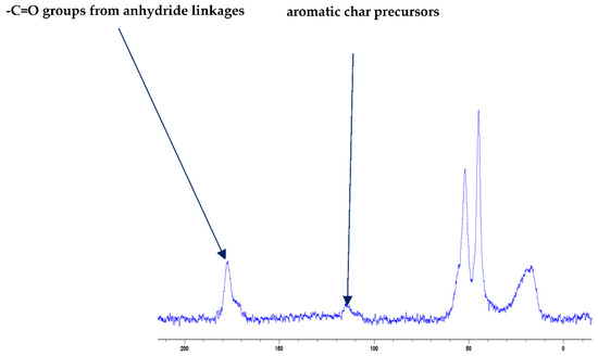 Solid-state 13C-NMR spectrum of char obtained from PMMA + DE-1-AEP (the abscissa denotes the chemical shift values, δ, in ppm and the ordinate corresponds to the signal intensity in arbitrary units).
