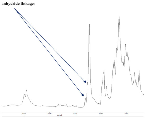 The FT-IR spectra of ‘partially’ burnt materials from PMMA (by igniting the tip of a solid plaque) and some optional modified systems recorded in the ATR mode are shown in Figure 2, Figure 3, Figure 4. The formation of carboxylic acid groups and anhydride linkages can be clearly seen in the spectra of the ‘partially’ burnt residues from the modified systems, whereas such features are absent in the spectrum obtained from the virgin material. The complementary information regarding the formation of the anhydride linkages and the formation of aromatic species is also found in the 13C NMR spectra of the char residues (as shown in Figure 1).
