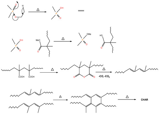 In the case of the PMMA-based systems, there is evidence that P-bearing compounds/groups, except TPP, TPPO and DOPO, upon thermal cracking during the early stages of flaming combustion, produce ‘phosphorus’ acid species. These acidic species can subsequently initiate the chemical pathway used to produce char precursors. In the case of TPP, TPPO and DOPO, it is more likely that they produce phosphorus- and/or oxygenated phosphorus-containing volatiles that can act in the gaseous-phase [18].
