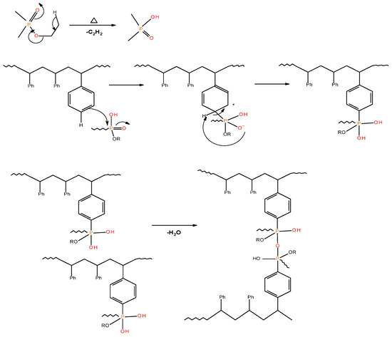 A schematic representation of the possible pathway leading to cross-linking and formation of polyphosphate linkages in modified PSt-based materials.