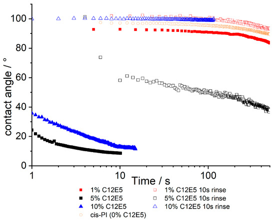 Contact angles for cis-PI films containing between 1 and 10% C12E5 both before and after a 10 s rinse with deionised water. The data are a function of time where 0 is the time that the probe droplet (water) is placed on to the surface. A cis-PI sample has also been shown in orange, showing 0% surfactant loading.